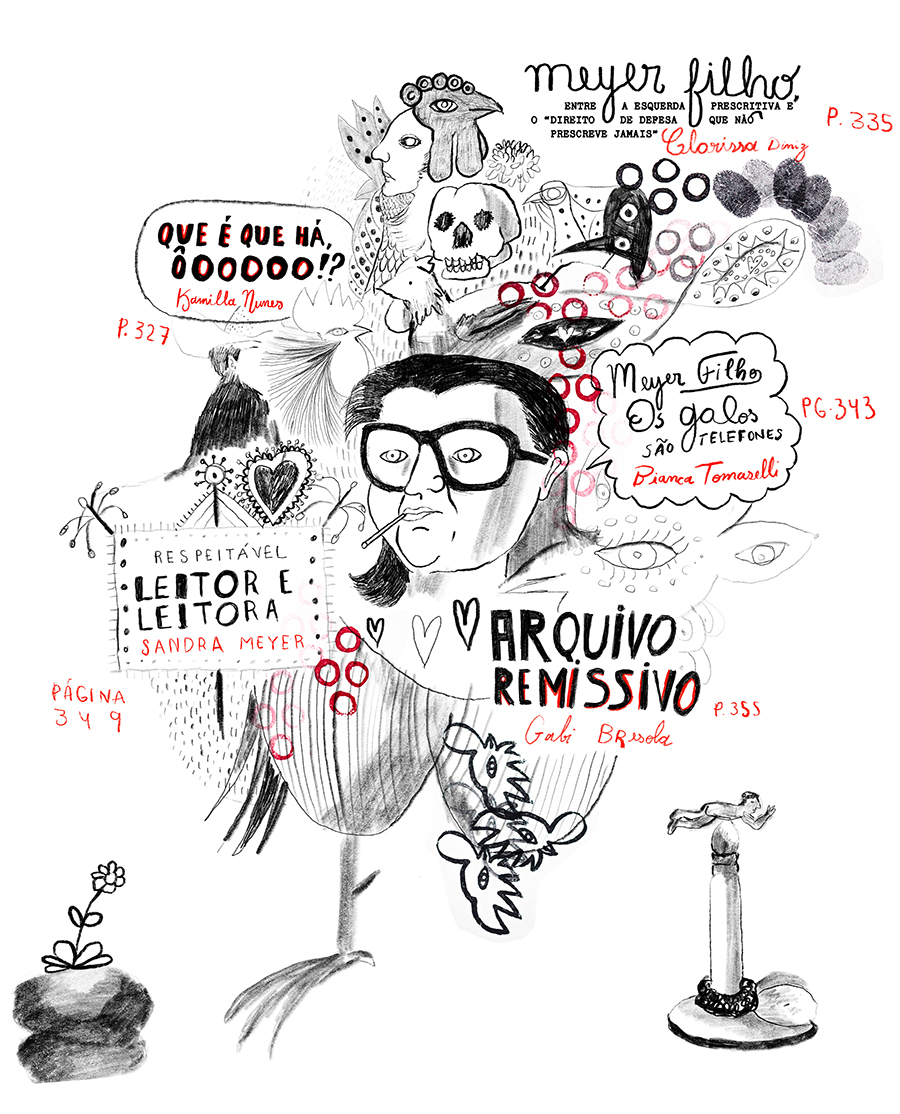 O implacável, dos arquivos de Meyer Filho, é a maneira como ele foi construído e preservado, a forma como ele decidiu contar sua própria história. Meyer não nos deixa esquecer a extensão de sua obra. Um exemplo disso é quando faz uma colagem de desenhos, com o comentário: “Estes são alguns dos 30.000 (TRINTA MIL) desenhos rápidos e rapidíssimos que fiz no período de 30.4.1941 a 2.7.1971, quando, para ganhar a VIDA, fui um (BOM) bancário….”.