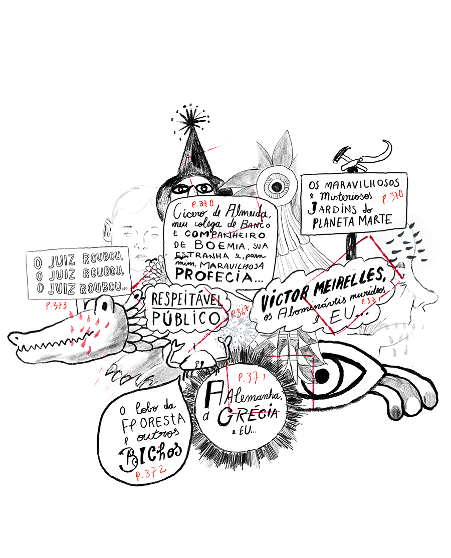Nesta ilha, há patas no lugar dos pés; no céu, sóis convivem com luas; das asas de uma ave nascem olhos no lugar de penas; dragões habitam a Terra e convivem com guerreiros siderais; tamanduás servem de apoio para anjos equilibristas; cavalos têm chifres e são montados por diabos; e não há um galo igual ao outro. É, sim, tudo verdade!!!!