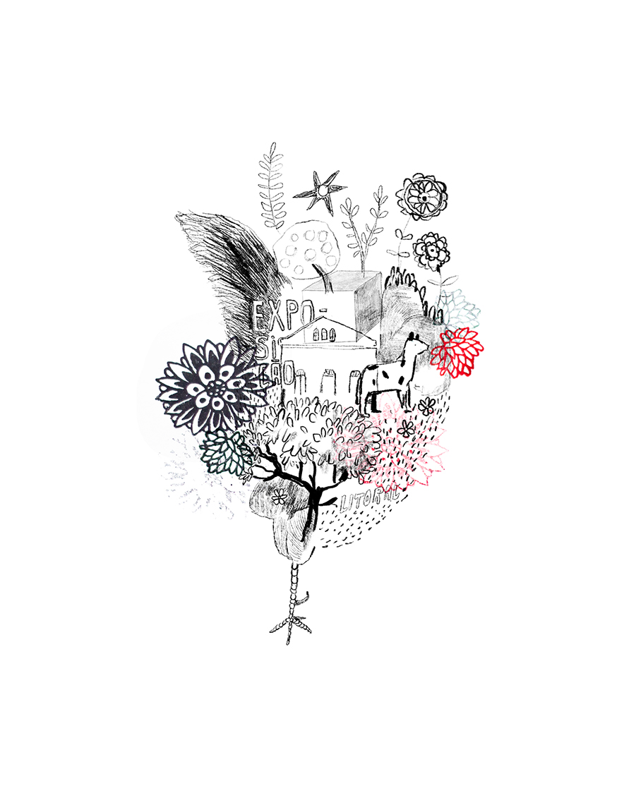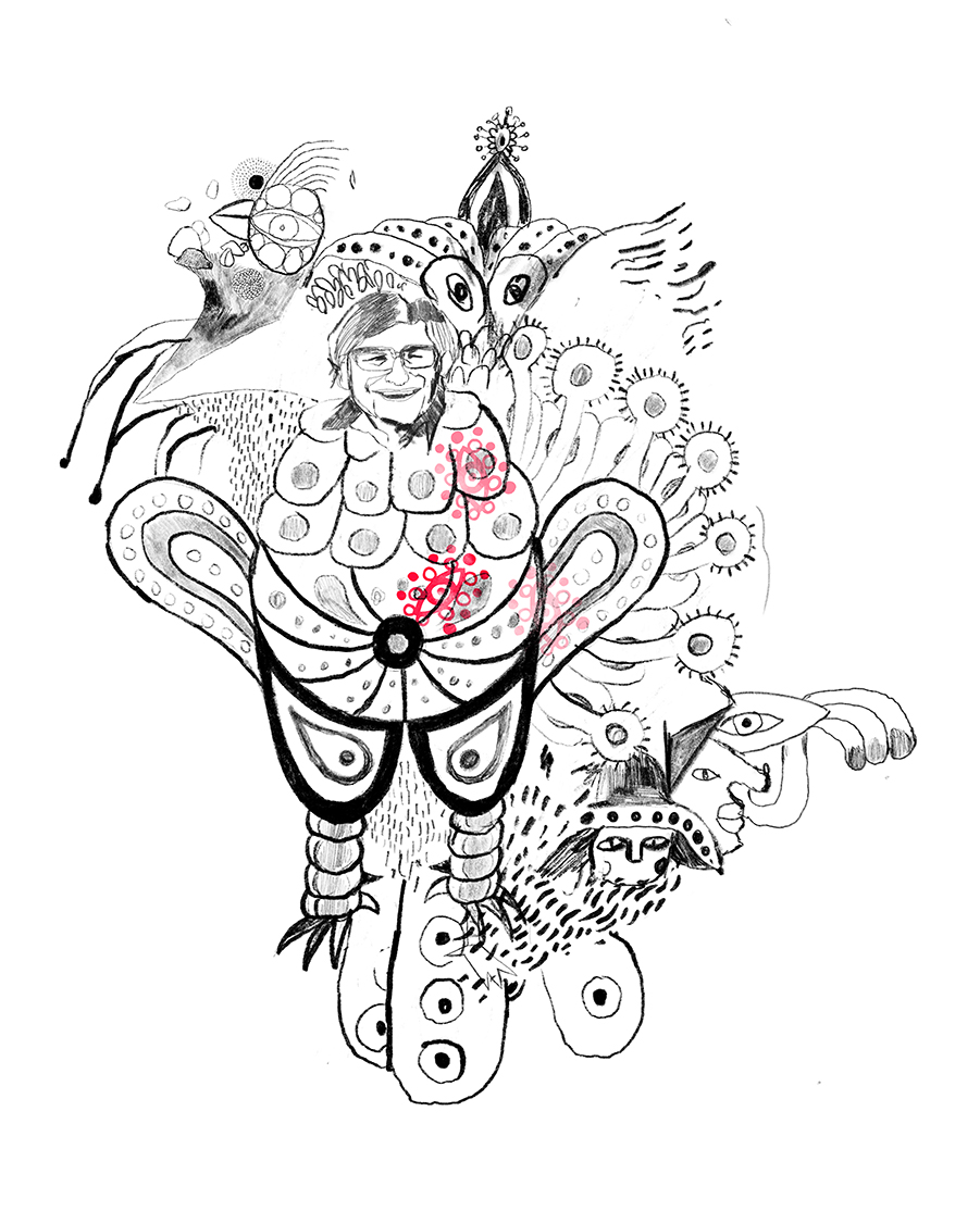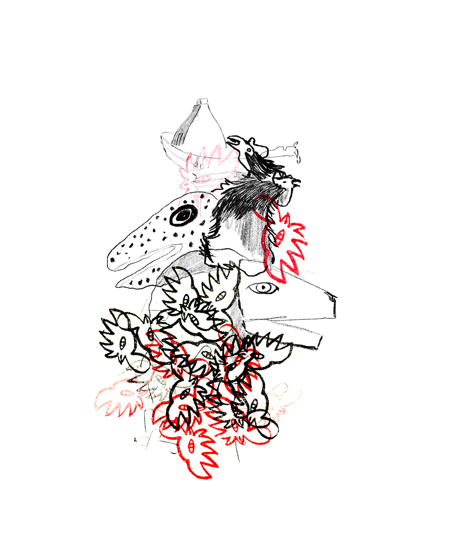 Este espaço traz composições afetivas que marcaram a vivência de Meyer Filho em família (com a minha mãe, Ruth, e meus irmãos, Helenita e Paulo). Temporalidades e ritmos de presença compartilhados no movimento entre arte e vida. O som do batuque na chegada do boi-de-mamão, o gosto de refrigerante das vernissages, os passeios pelo interior da Ilha de Santa Catarina para desenhar, o sabor da garapa produzida no fundo do quintal, o namoro no banco de ferro da garagem-expositiva, a mãe tecendo tapeçarias, as alfaces frescas recém-colhidas, a casa-atelier sempre cheia de gente, a carinhosa babá, a pose ao lado do coco-galo gigante, as conversas de bar regadas a uma Brahma estupidamente gelada, a coreografia de dança inspirada nele, o jardim florido de galos entre as rosas…