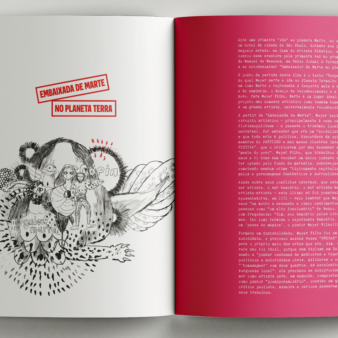 O livro Arquivos Implacáveis Meyer Filho foi criado a partir da noção de arquipélago-sistema solar, no qual ilhas-planetas são formadas por aspectos pessoais, artísticos, sociais, profissionais, políticos e históricos da vida e da obra de Meyer Filho. Ilhas-planetas estas que remontam à geografia dos lugares em que o artista viveu: a Ilha de Santa Catarina e o planeta Marte. Estes movimentos, da ilha ao cosmos, organizam situações e discursos que questionam as noções de local e universal, de cultura popular e erudita e, por que não, as noções de loucura e processo artístico.